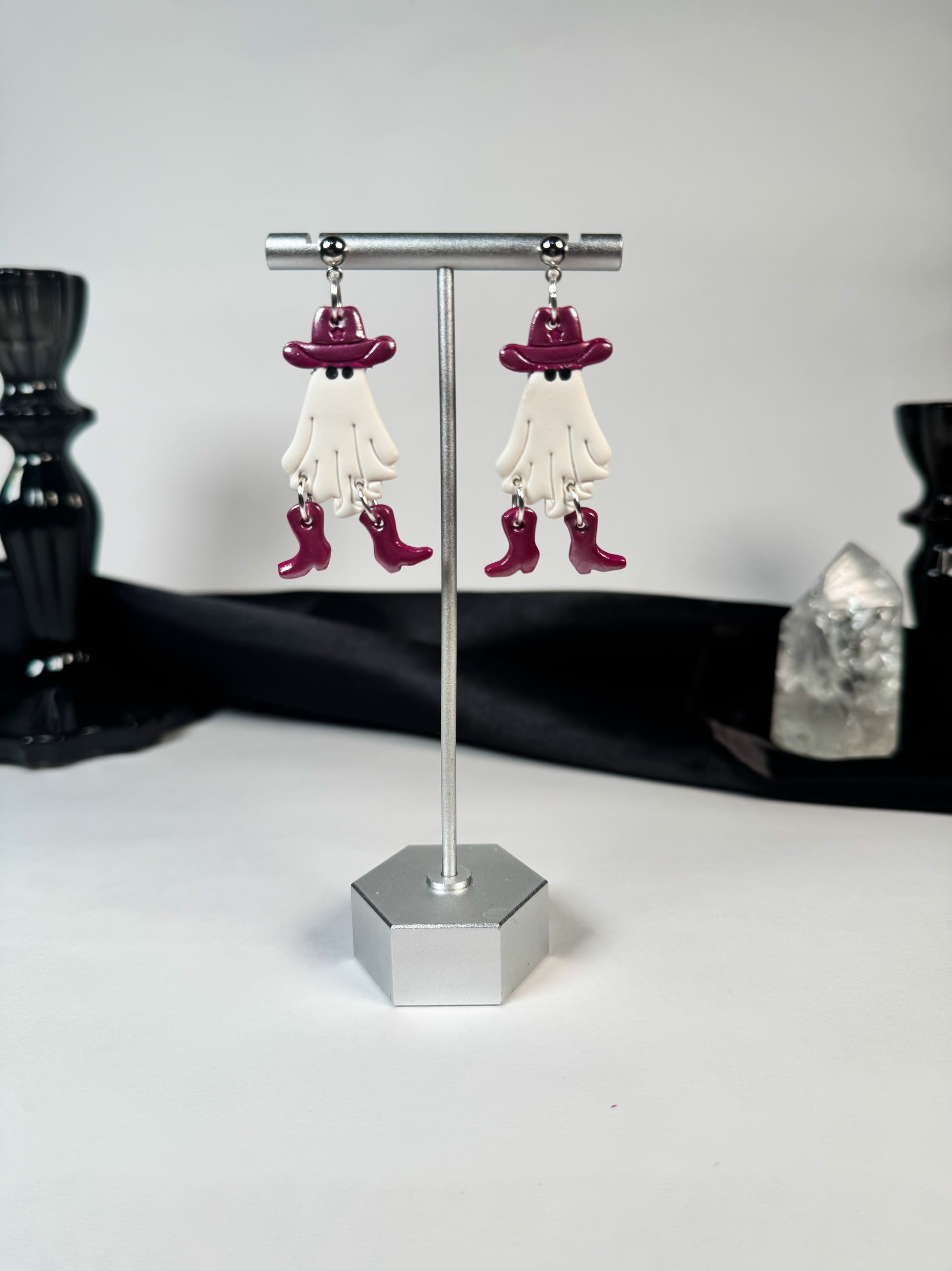 I couldn't be more thrilled! The craftsmanship is impressive; each piece is meticulously sculpted, showcasing a delightful combination of whimsical ghost and adorable cowgirl elements. Love the details—from the tiny hat with a cute star to the cowgirl boots- can’t wait to wear them in Nashville this Halloween season!